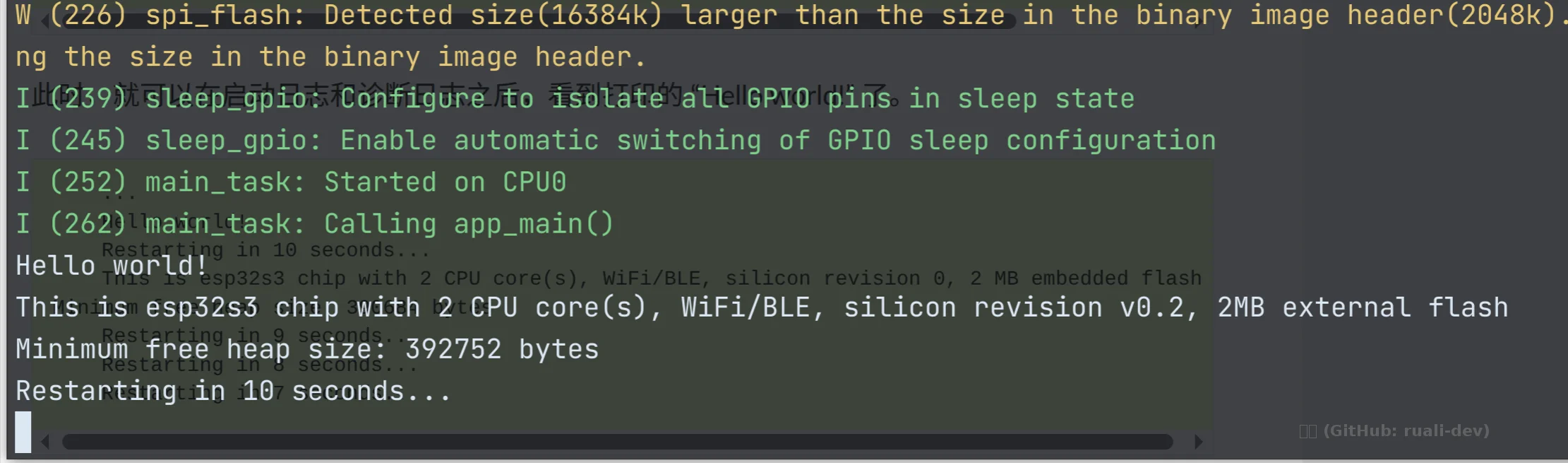 烧录成功,打开监视器,验证例程
