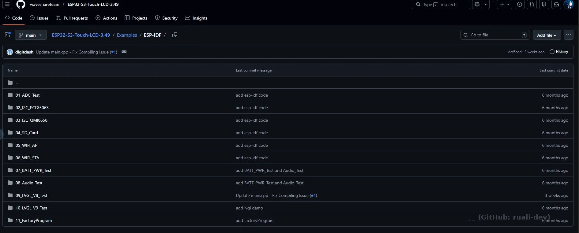 此仓库内含多个 ESP‑IDF 示例工程。选择 Examples/ESP‑IDF/11_FactoryProgram 作为首个验证工程(出厂程序),该工程集成显示、触摸、蓝牙、SD 卡、传感器等全功能。