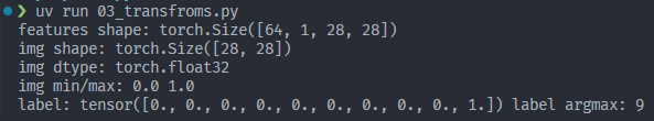 主要讲的是数据预处理(transform/target_transform)API 如何把图片/标签转换成训练所需的 Tensor/格式。