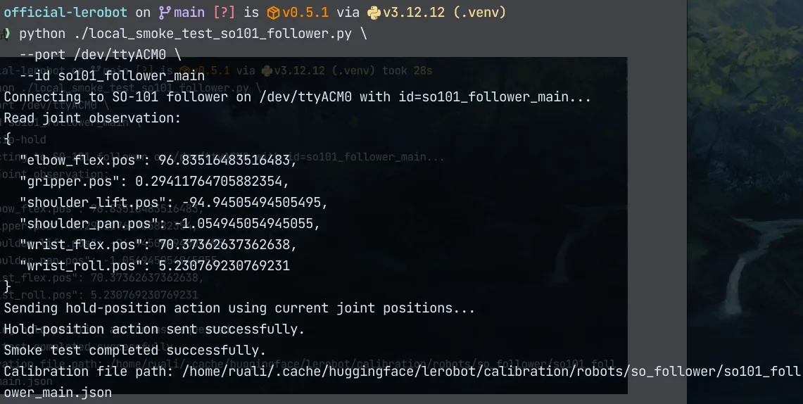 测试结果:连接、读取关节位置、发送保持位置命令均成功。输出显示关节位置数据,并确认校准文件路径。